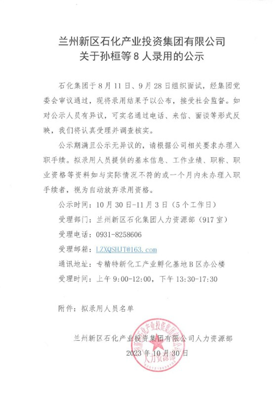 蘭州新區(qū)石化產業(yè)投資集團有限公司關于孫桓等8人錄用的公示