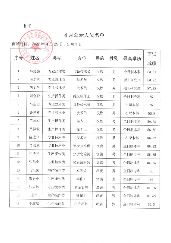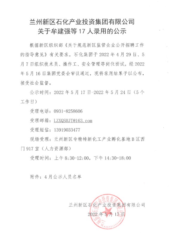 蘭州新區(qū)石化產(chǎn)業(yè)投資集團(tuán)有限公司關(guān)于牟建強(qiáng)等17人錄用的公示