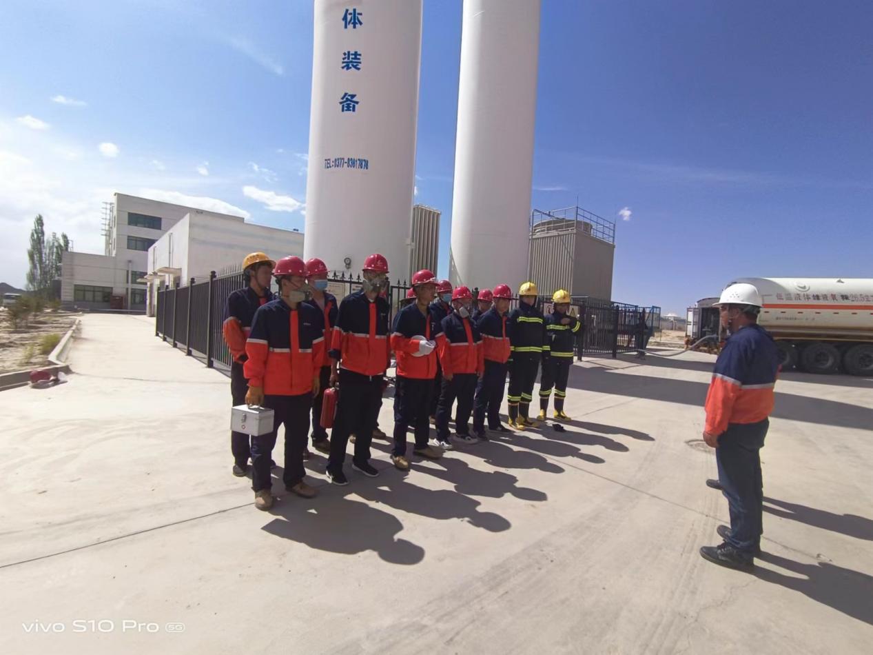 為有效預(yù)防和應(yīng)對(duì)突發(fā)事件應(yīng)急處置能力,識(shí)別資源的需求,明確相關(guān)機(jī)構(gòu)、人員的職責(zé),進(jìn)一步提升應(yīng)急響應(yīng)人員的業(yè)務(wù)素質(zhì)和能力。5月31日,博石環(huán)保公司秉承“安全第一,預(yù)防為主,綜合治理”的安全生產(chǎn)方針,結(jié)合公司實(shí)際情況,在廠區(qū)液氧罐作業(yè)區(qū)組織了液氧儲(chǔ)罐泄漏事故應(yīng)急救援演練。