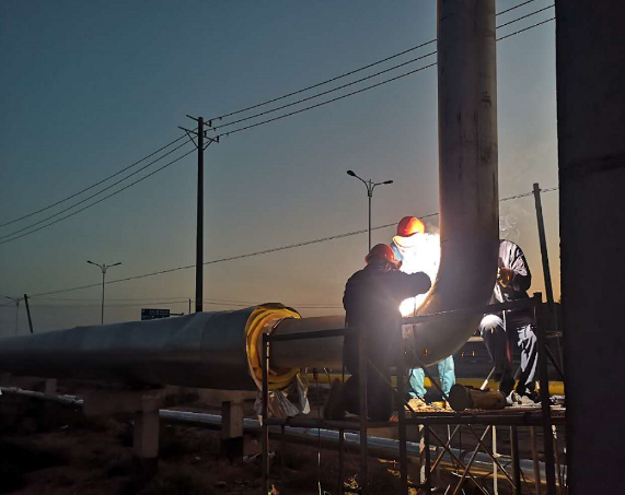 熱力管網(wǎng)一期項(xiàng)目位于蘭州新區(qū)綠色化工園區(qū)南區(qū)塊,由蘭州新區(qū)化學(xué)工程有限公司承建,主要負(fù)責(zé)為園區(qū)企業(yè)提供生產(chǎn)所需的蒸汽及采暖所需的熱水。該項(xiàng)目主管網(wǎng)已于2019年11月全線貫通,并投入使用。后期因新入園企業(yè)的增加,導(dǎo)致原管線預(yù)留口及企業(yè)門頭桁架發(fā)生變更需改遷。為了不影響園區(qū)企業(yè)生產(chǎn)運(yùn)營,石投集團(tuán)經(jīng)過多方協(xié)調(diào),商定于9月29日早上七點(diǎn)停汽。此次熱力管網(wǎng)管道改遷工作任務(wù)緊,難度大,工程公司迎難而上,通過前期對圖紙的精研,科學(xué)組織,精準(zhǔn)施策,經(jīng)過15個(gè)小時(shí)連續(xù)奮戰(zhàn),最終完成6座企業(yè)門頭桁架蒸汽管道的改遷、6處新增蒸汽預(yù)留接口的安裝及2處DN400旋轉(zhuǎn)補(bǔ)償器位置的變更。