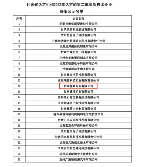 10月18日,科技部火炬中心發(fā)布了“關(guān)于對(duì)甘肅省認(rèn)定機(jī)構(gòu)2022年認(rèn)定的第一批、第二批高新技術(shù)企業(yè)進(jìn)行備案公示的通知”,其中專精特新化工產(chǎn)業(yè)孵化器內(nèi)的甘肅峻茂新材料科技有限公司和甘肅瀚聚藥業(yè)有限公司2家入駐企業(yè)被成功認(rèn)定為2022年高新技術(shù)企業(yè)。