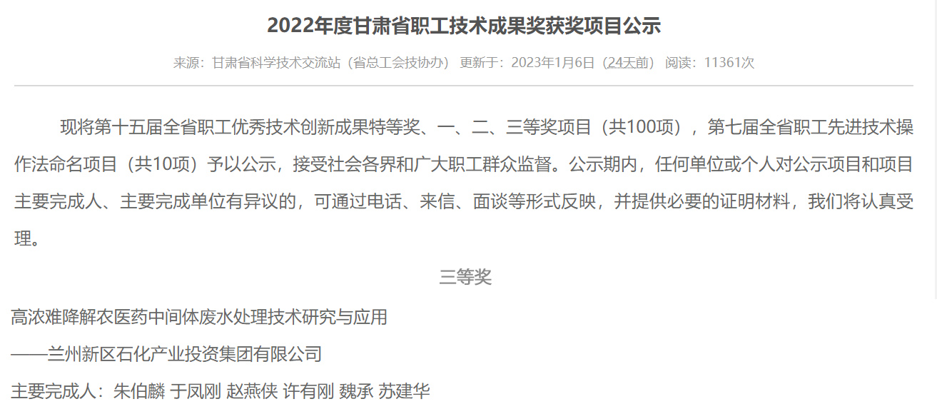 近日,甘肅省總工會對2022年度甘肅省職工技術(shù)成果獎獲獎項目進(jìn)行了公示,石化集團(tuán)博石環(huán)保公司《高濃難降解農(nóng)醫(yī)藥中間體廢水處理技術(shù)研究與應(yīng)用》獲得三等獎。