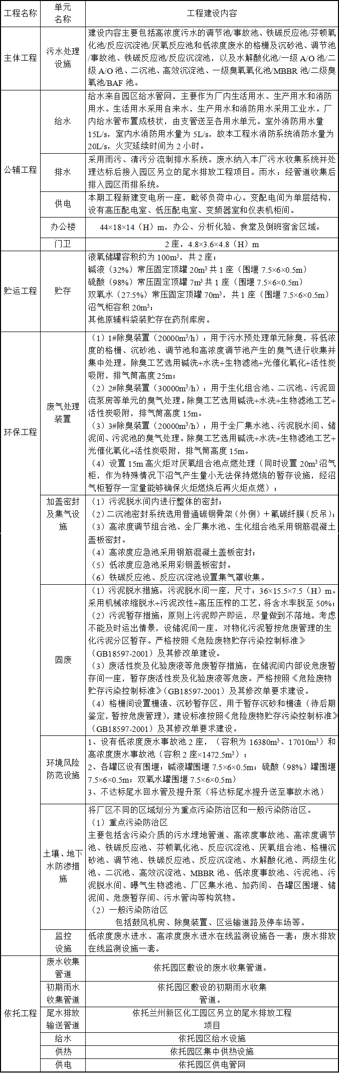 本項(xiàng)目位于蘭州新區(qū)化工園東區(qū)最南端,緯五十路南側(cè),經(jīng)三十五一支路與經(jīng)三十六路之間。廠區(qū)中心位置地理坐標(biāo)為:東經(jīng)103.566948944°,北緯36.613826038°,設(shè)計(jì)處理規(guī)模為1.25萬(wàn)m3/d,其中低濃度廢水處理量為1.00萬(wàn)m3/d;高濃度廢水2500m3/d,設(shè)計(jì)出水水質(zhì)執(zhí)行《城鎮(zhèn)污水處理廠污染物排放標(biāo)準(zhǔn)》(GB18918-2002)中一級(jí)A標(biāo)準(zhǔn)。項(xiàng)目主要建設(shè)內(nèi)容見(jiàn)表1。